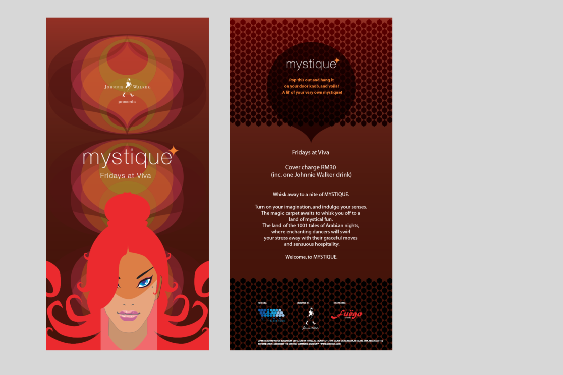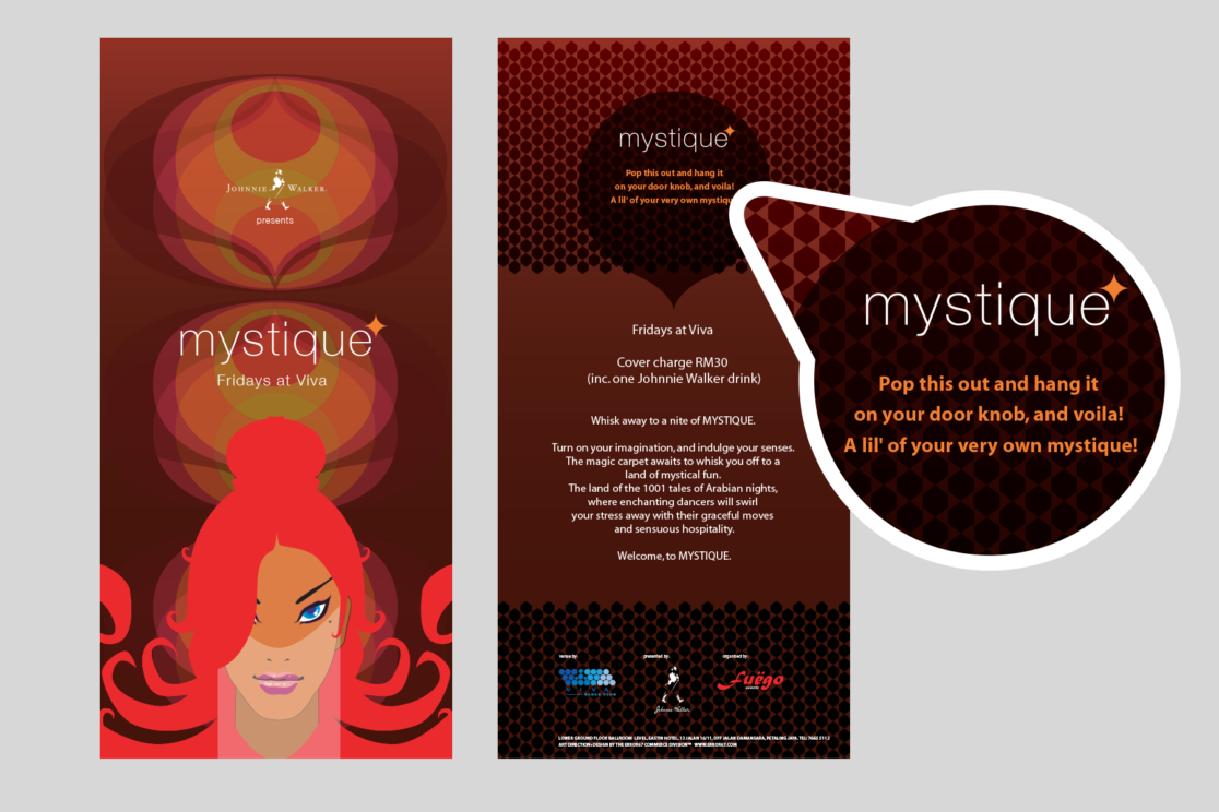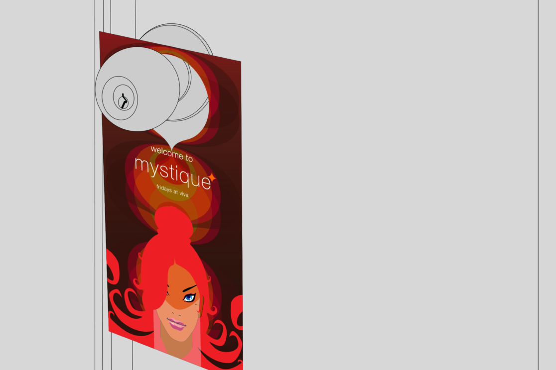 Mystique was a weekly themed event held at the Viva Club. We created the character of the ‘Mystique Girl’ as a recurrent mascot for the events. We designed posters and leaflets that could be transformed into doorknob hangers that provided a little guerrilla marketing.
